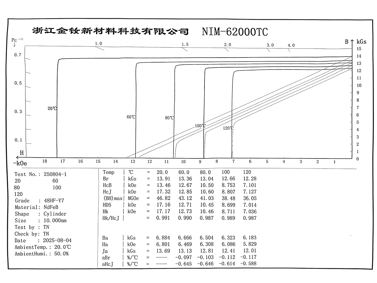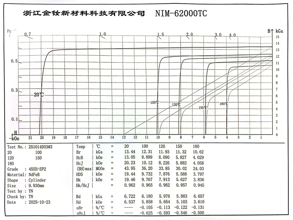 (1) The temperature ranges for calculating the temperature coefficient are divided as follows: H grade and below, ΔT: 20–100°C; SH grade and above, ΔT: 20–150°C. The temperature coefficient is for reference only; for detailed demagnetization curves please contact our sales staff.